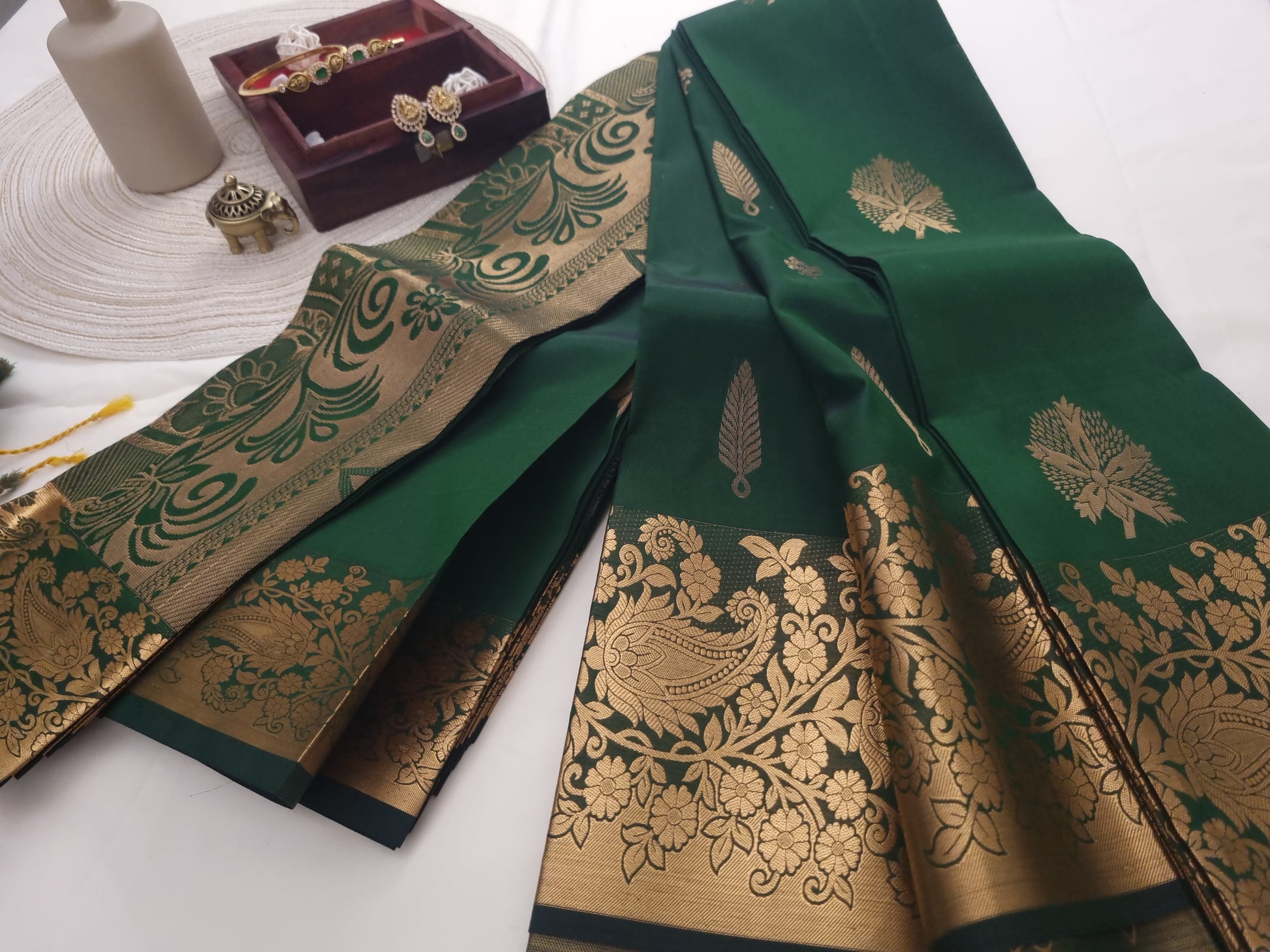 Our Bottle Green & Gold Semi Kanjeevaram Soft Silk Saree is here — royal, elegant & absolutely timeless.